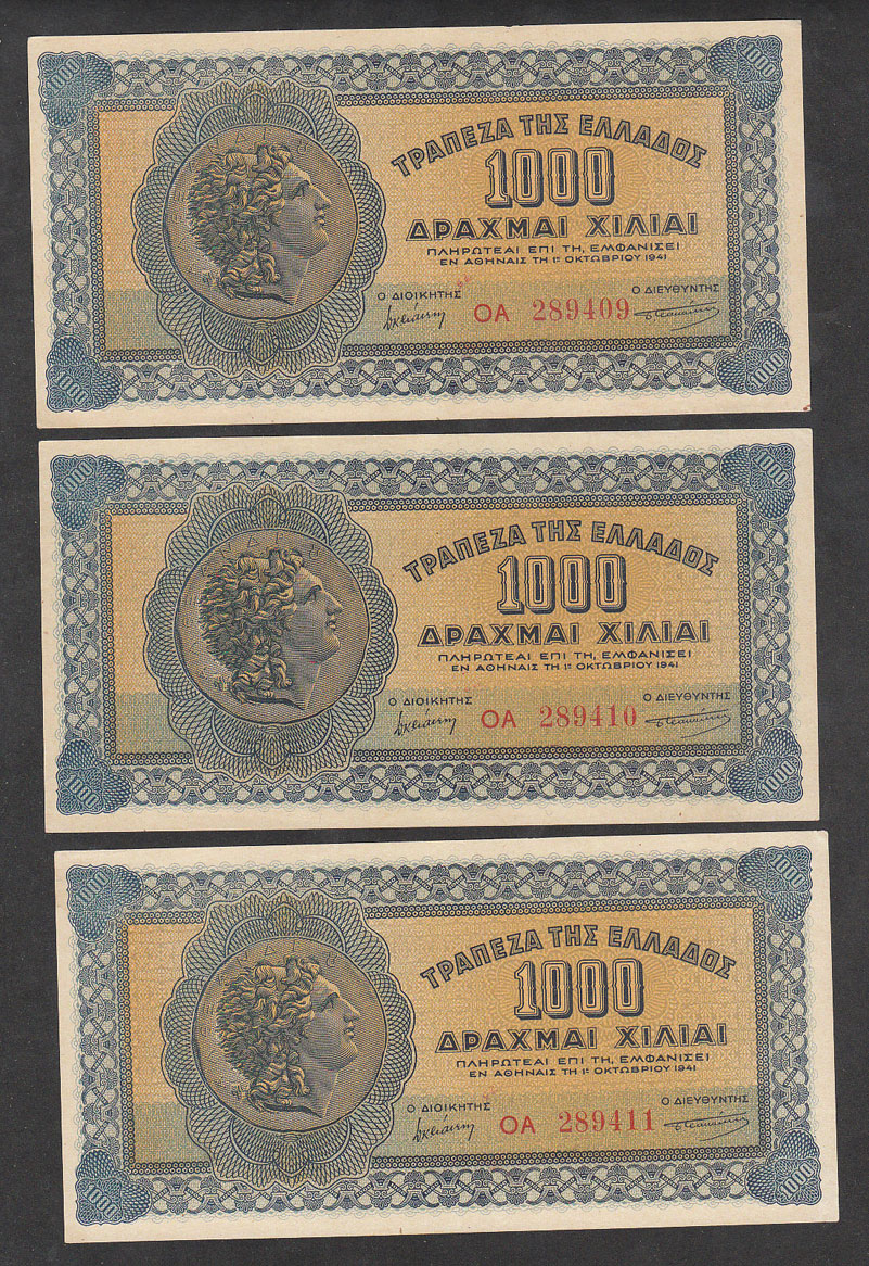 Greece 3 X 1000 drachmas 1941 consecutive number ( Great Alexander )