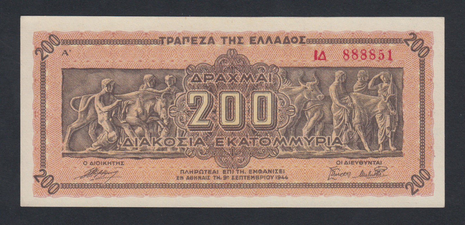 GREECE 200 MILLION DRACHMAS 1944 PICK # 131 UNC