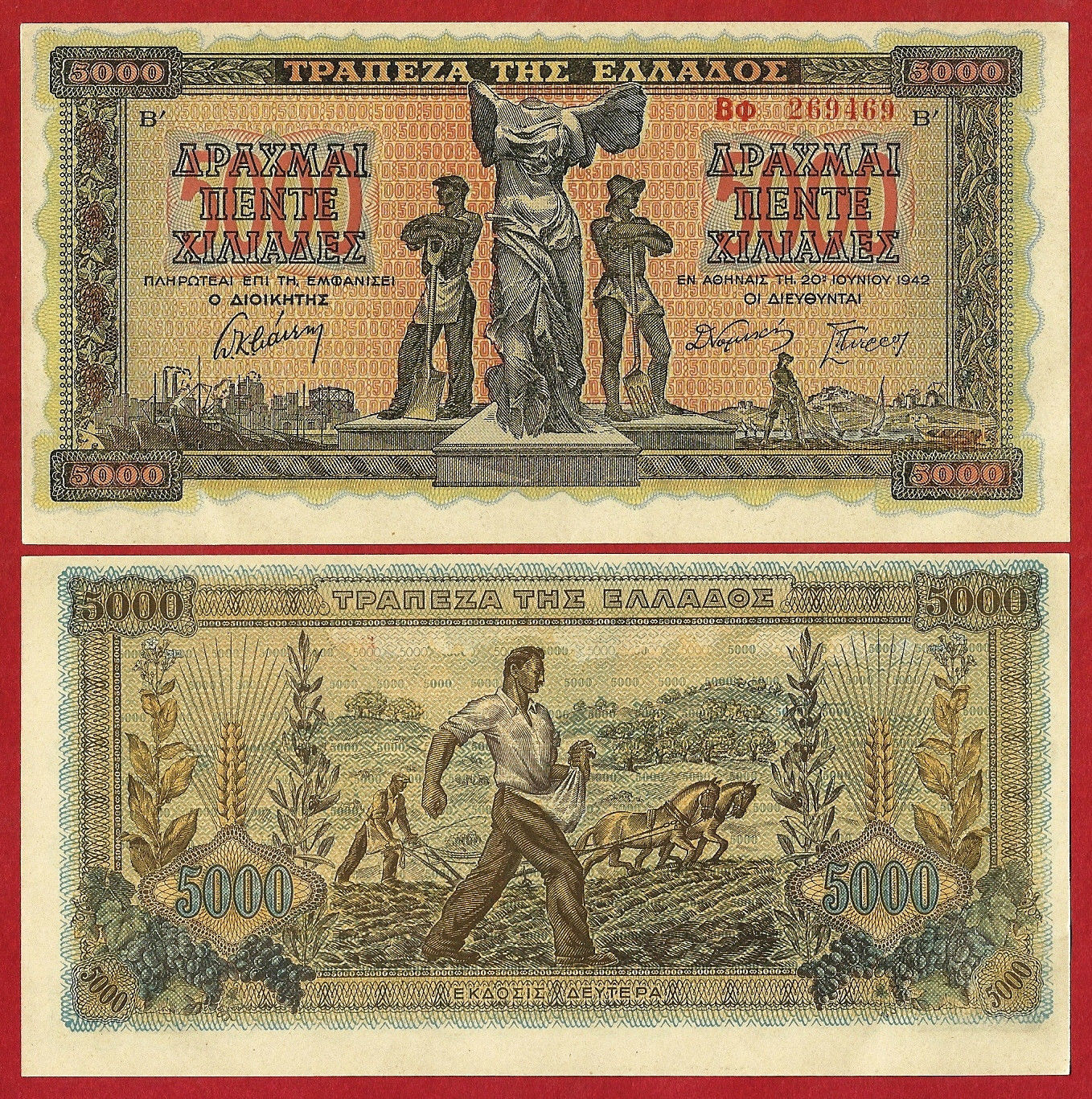 Greece , 5000 Drachmas 1942 , Without Watermark , Pick:119a, Condition:UNC