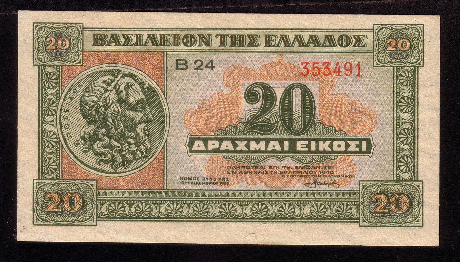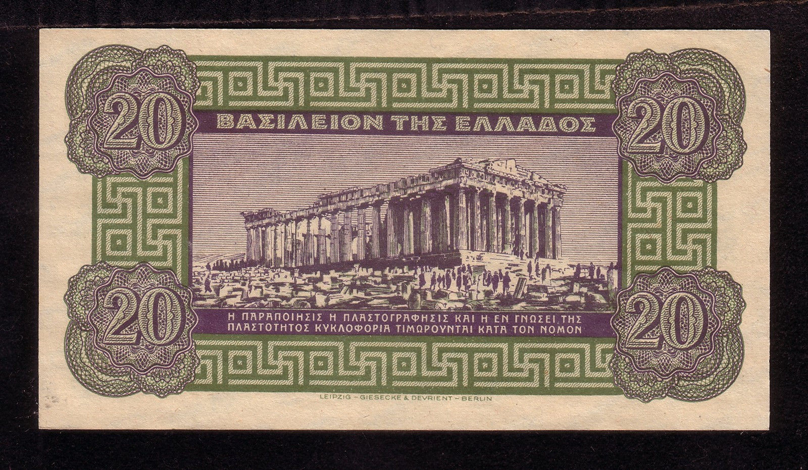 GREECE 20 DRACHMAS 1940 UNC!!!