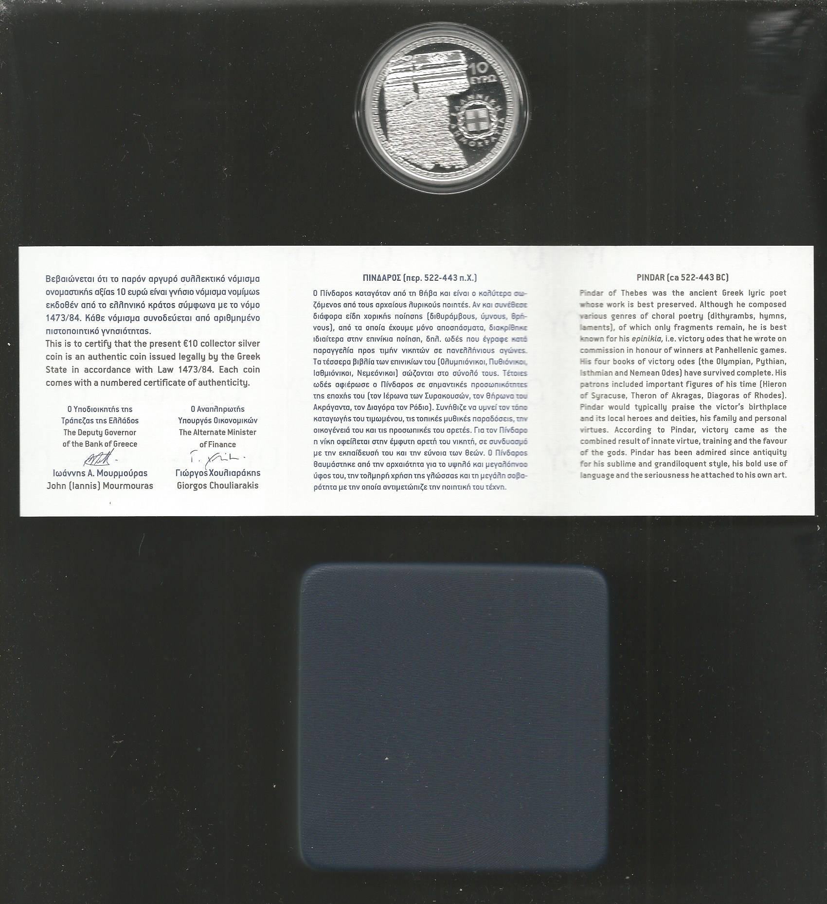 Greece: 10 EURO silver proof coin 2018 "PINDAR" in Box with C.O.A. Nr. 1373