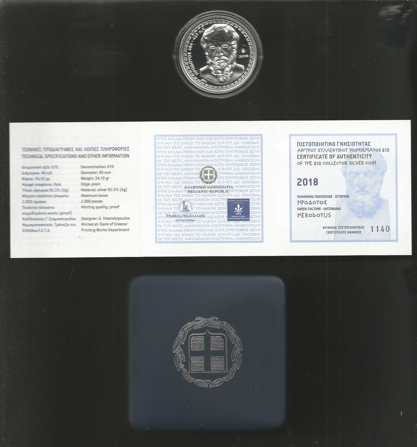 Greece: 10 EURO silver proof coin 2018 "HERODOTOUS" in BOX with C.O.A Nr. 65