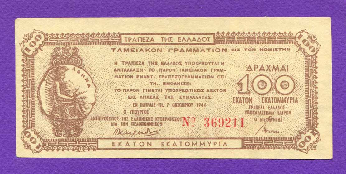 100.000.000 Δραχ 1944 Πατρών ΕΞΑΙΡΕΤΙΚΟ Νο369211