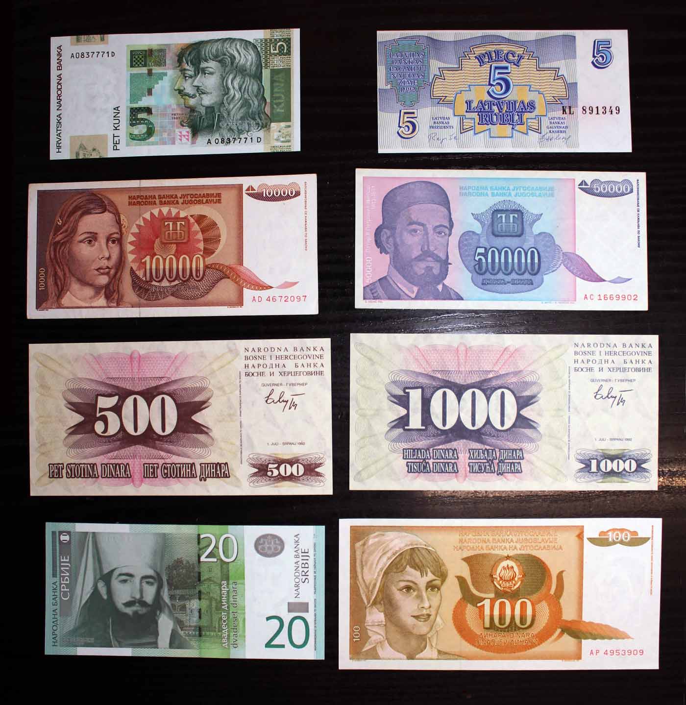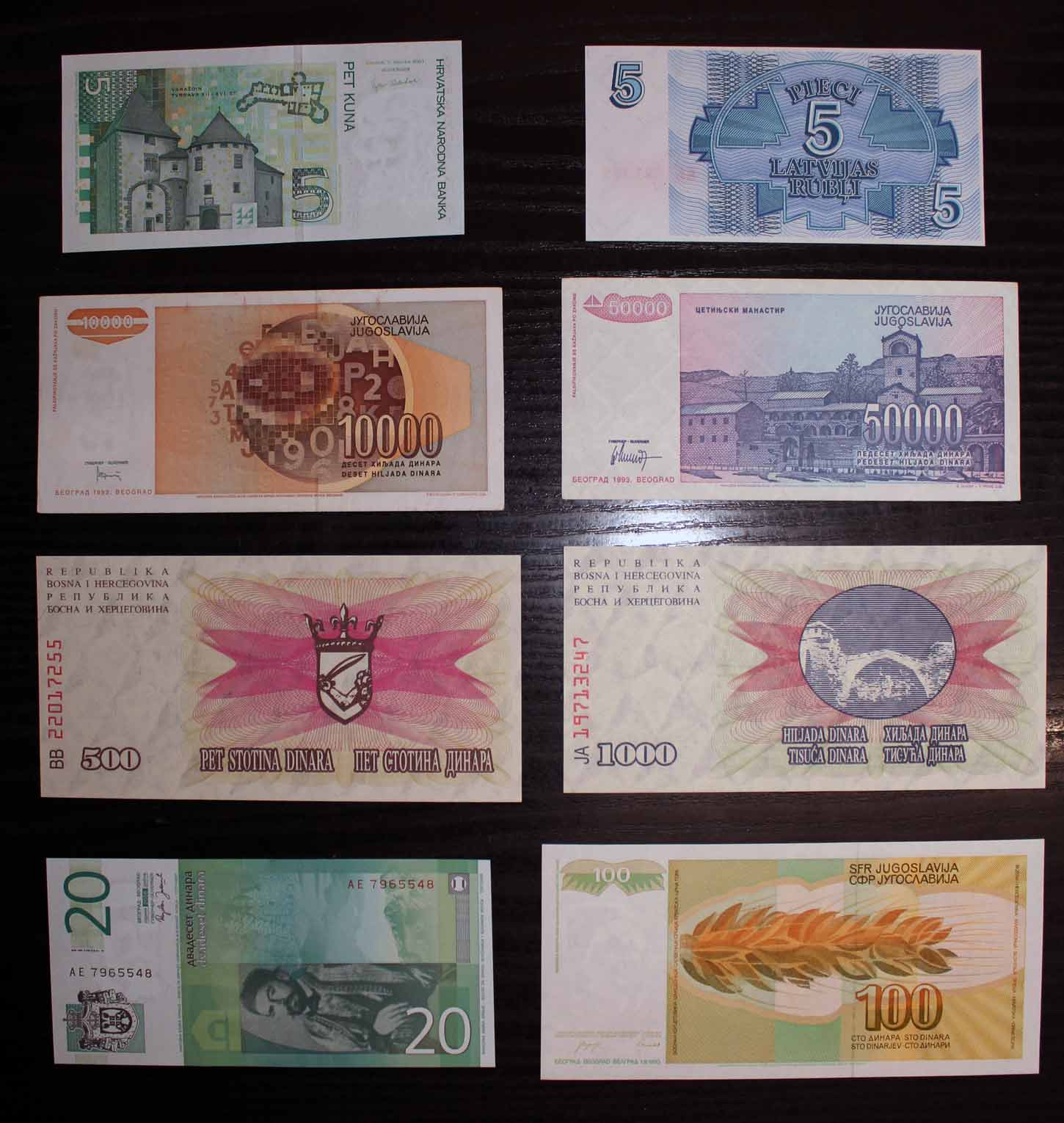 Το παρόν σετ περιέχει χαρτονομίσματα από Κροατία, Γιουγκοσλαβία, Βοσνία Ερζεγοβίνη, Σερβία και Λετονία, (το Γιουγκοσλάβικο 10.000 δηνάρια=AUNC).