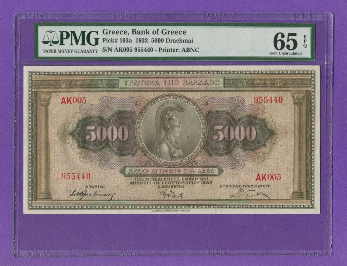 5.000 Δραχμές 1932 ΠΙΣΤΟΠΟΙΗΜΕΝΟ GEM UNC 65 με Exceptional Paper Quality!!
